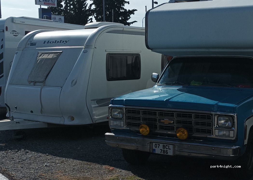 Great stopover. Very friendly and helpful staff. Good for repairs at very reasonable prices. Everything free. water, electric toilet cassette dump etc. 25 minutes walk to a small town. bus stop to Thesaloniki 100mtrs. I highly recommend it.
