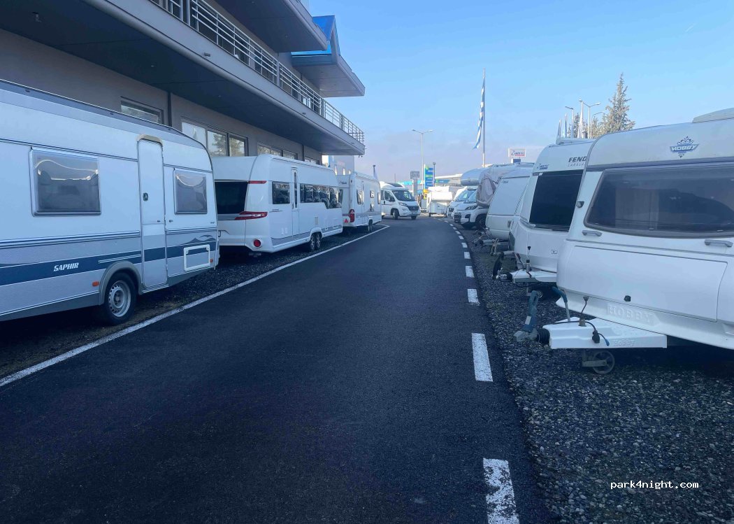 Sommes venus en esperant y rester 3 nuits pour visiter Thessalonique. Avons fui immediatement en arrivant sur place.Tous les véhicules sont entassés les uns sur les autres (à peine la place d'ouvrir la porte de cellule !). Plus de place et sol en cailloux pas tres propre. Le tout à moins de 20 m de l'autoroute. Le personnel de la concession est peut être sympa mais nous n'avons pas pu tester. Je comprends pourquoi c'est gratuit.