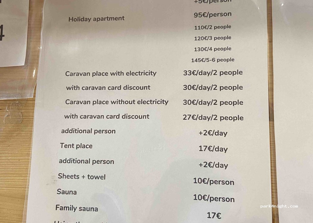 Nous avons payé 24,50 € pour une nuit en camping-car sans électricité + 1 machine à laver pour 2 personnes. Accepte les chiens. Sanitaire très propre. Super camping !