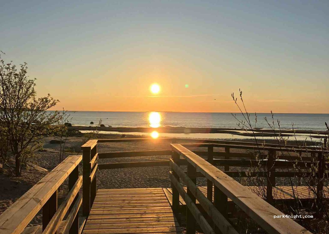Wunderschön in die Natur integrierter Platz, der ca. 20km von der E8 entfernt liegt. Groß und mit Bäumen bestanden, man kann ruhig stehen. Vom Platz geht es über 3 Holzstege 40m über eine flache Düne an einen bemerkenswerten Strand. Die Düne schützt den Platz zugleich vor möglichem Wind. 3 Wanderwege können erkundet werden. Insgesamt fast zu schade, um nur für eine Nacht zu bleiben.