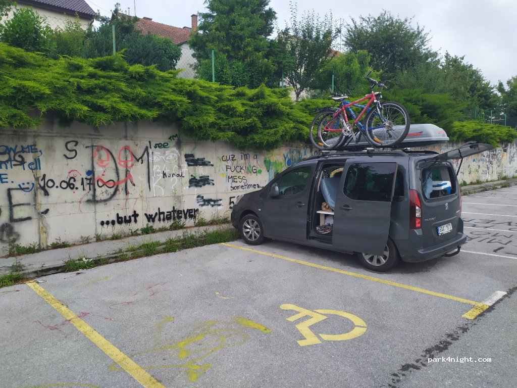 We arrived at night, quiet place in front of aquapark. Not paid. We stand here whole night alone. Quite messy, but fine to oversleep.
