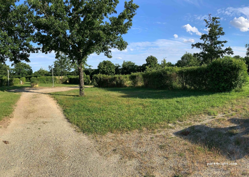 Aire payante Camping-Car Park. Emplacement délimité avec haie. Terrain herbeux.