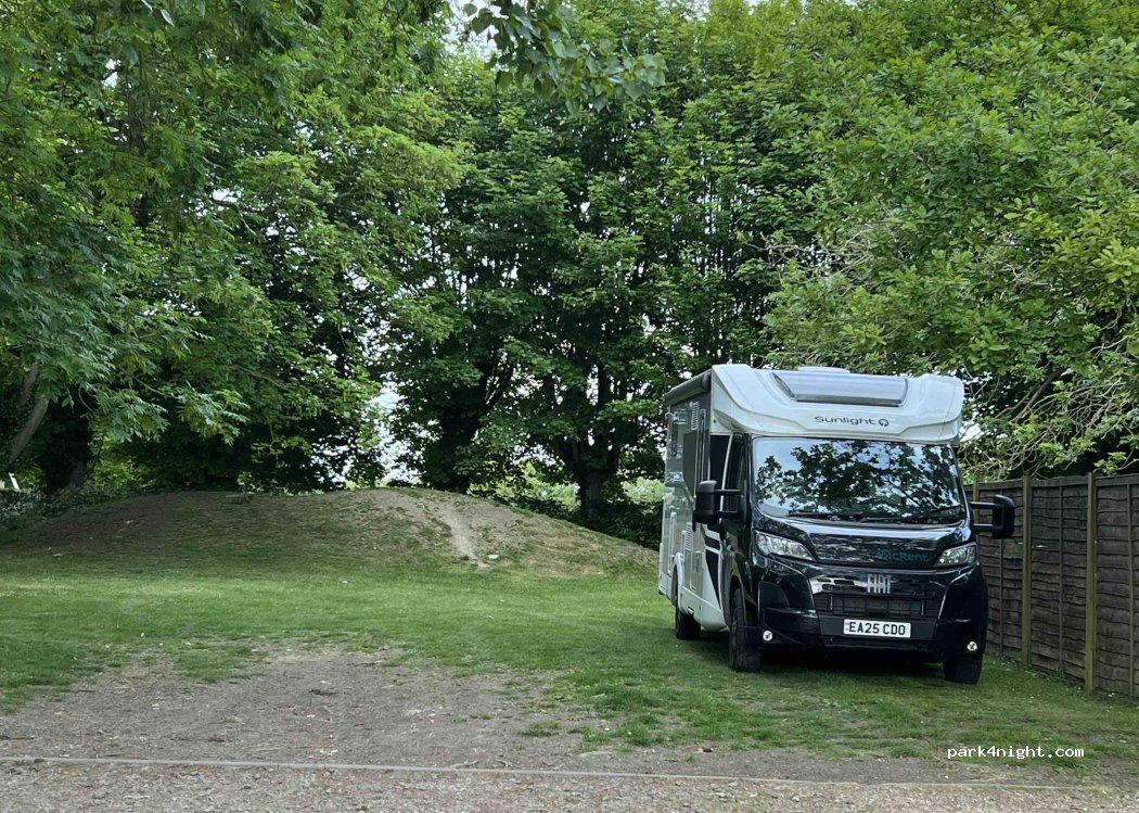 A quiet spot at the top of the car park after seeking permission from the host. We enjoyed a superb dinner and our dog enjoyed walking from the pub with direct access to footpaths. Our unit is 6m length anything longer could present a problem with access and egress. There is a little aircraft noise but it is intermittent