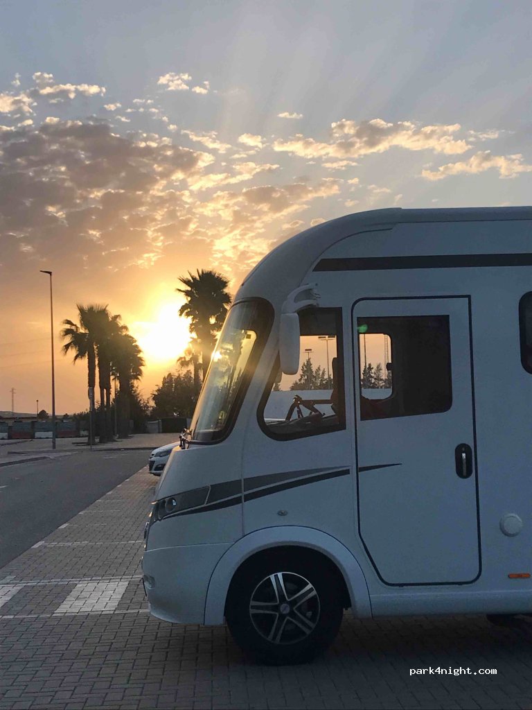 Es el aparcamiento del polideportivo de Lebrija, las plazas son de tamaño para turismos, con lo que se ocupan dos plazas para estacionar una AC. Noche tranquila en día de semana de noviembre.