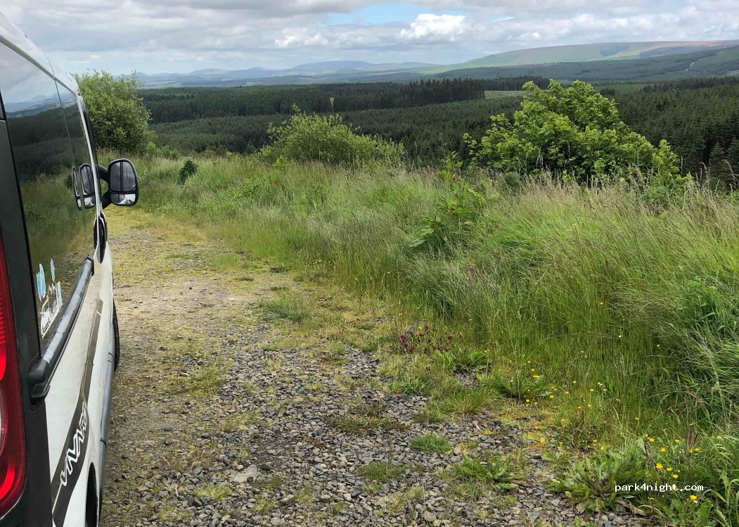 Partie de l'essai Forestry and Land Scotland Stay the Night 2022. Parking avec vue sur la vallée. Beau point de vue et idéal pour le lever du soleil. Loin de la route, calme et tranquille. Quelques moucherons