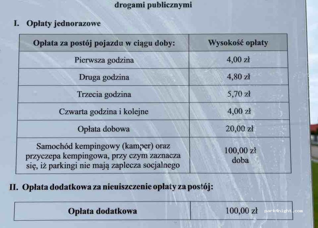 cena za parking auto osobowe 20zł/24h natomiast za camper 100zł/24h