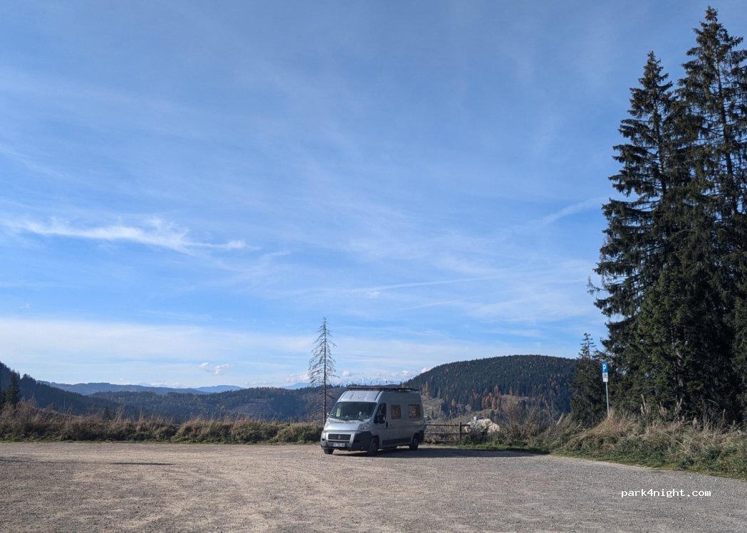 Parking du lac, il est possible d’y dormir. Le tarif est de 12€ si < 12h, sinon 24€ pour 12-24h. On a pu dormir loin des autres van et voitures. Très belle vue sur la forêt. WC disponible en journée mais fermé la nuit. Présence d’un snack en journée, le soir on peut utiliser les tables en bois du snack pour un pic nic. Sol en gravier, bien plat.
