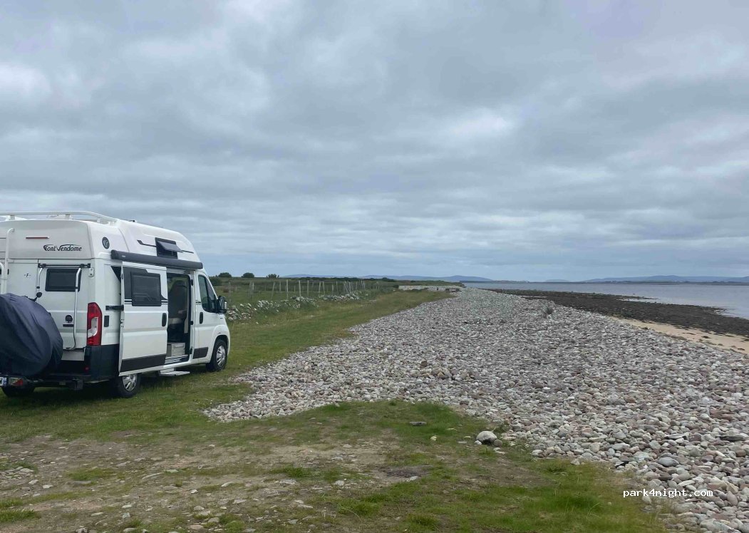 Área aislada equipada con 3 mesas repartidas en una franja de 100m X 6-7m en el borde de la playa Dooniver. Muy tranquilo para pasar la noche allí. Más adecuado para furgonetas de 6 m que pueden dar la vuelta al final y aparcar junto a la valla para ovejas. No hay señal de prohibición