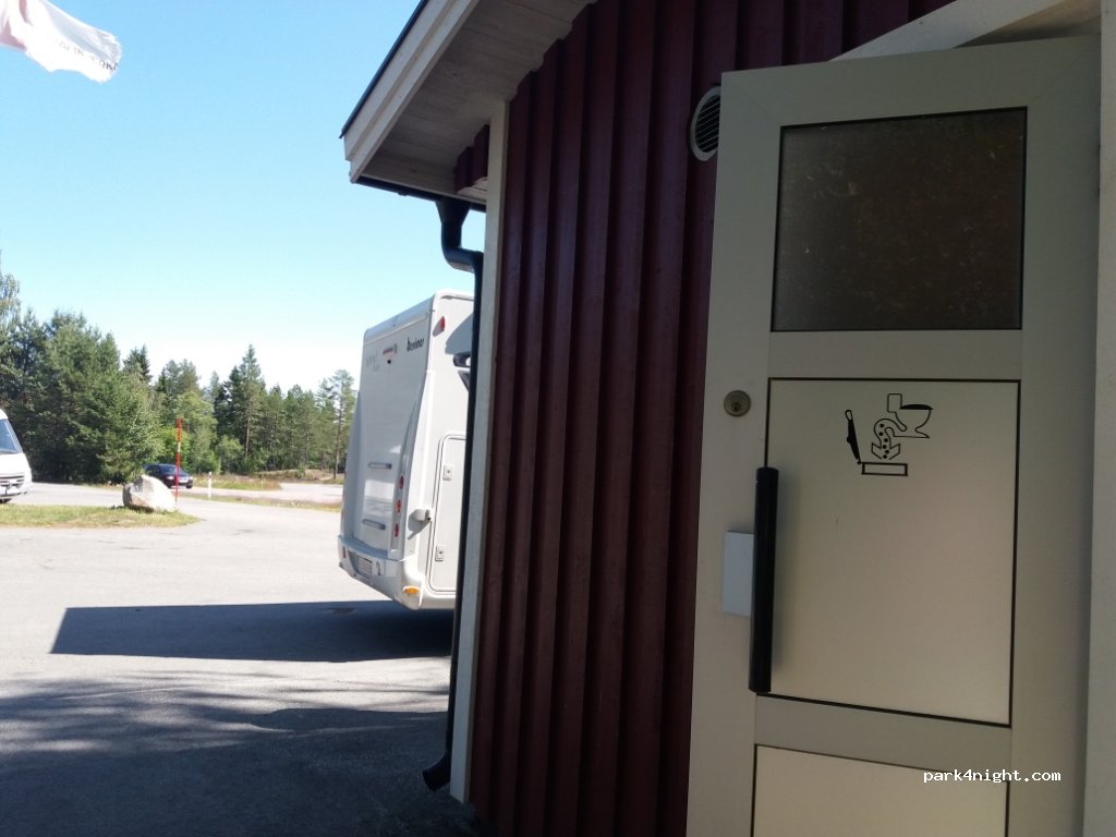 At the end of the parking lot is a hut with toilet and latrine. Some benches and a fire pit. Not busy at night. Public (Trafikverket). Please do your best to keep this spot clean and tidy.