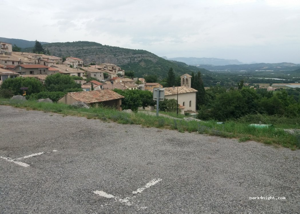 Parking visiteurs. Situé à 150m depuis l'entrée du village. À droite en hauteur. Légèrement en pente. Vue imprenable