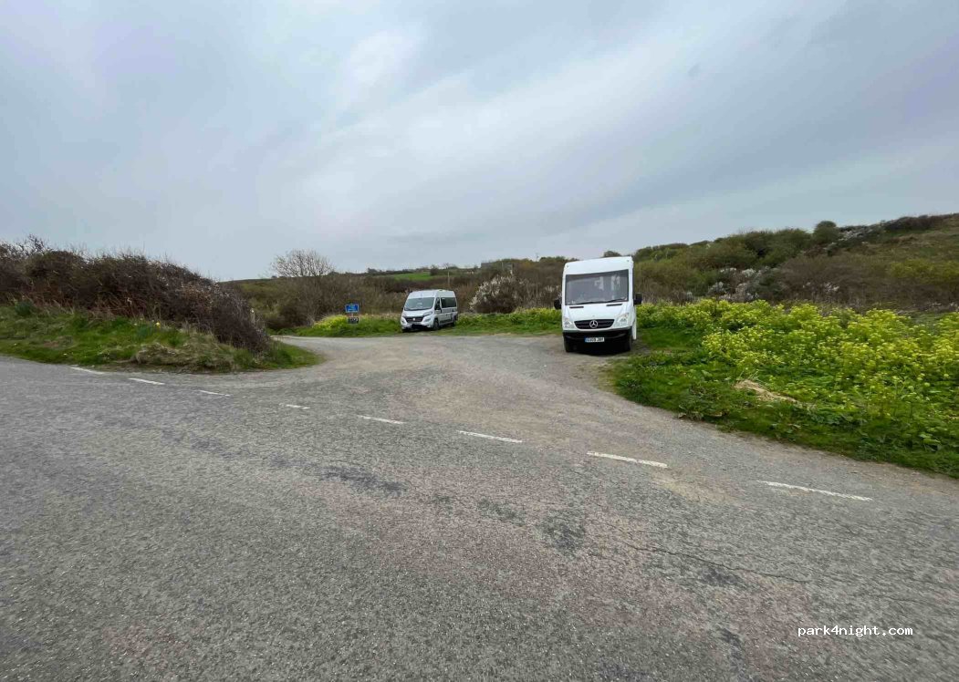 Wow! What a view. Nice quiet park up. People come and park here in the evening to walk to the beach or coast path to watch the sunset and after that nothing. We were the only van although one arrived in the morning. Lovely and clean. Keep it that way. Tractor came and went in the evening and morning so leave access.