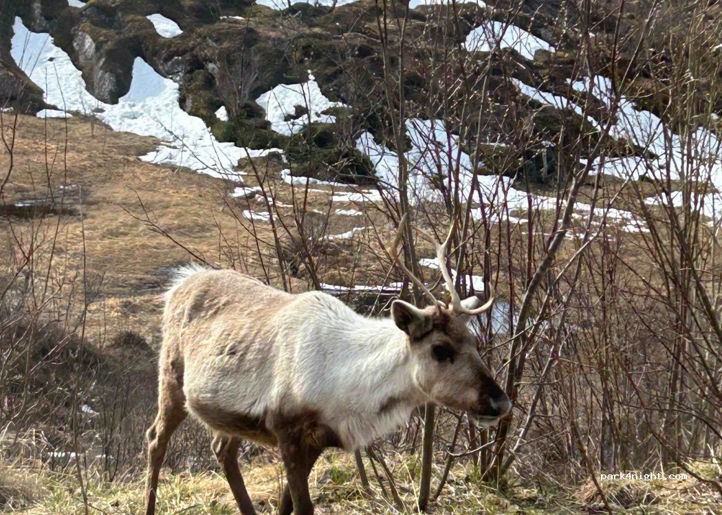 Sehr schön und ruhig gelegener Parkplatz oberhalb eines kleinen Flusses. Die Rentiere waren zum Frühstück hier und sind dann weitergezogen.