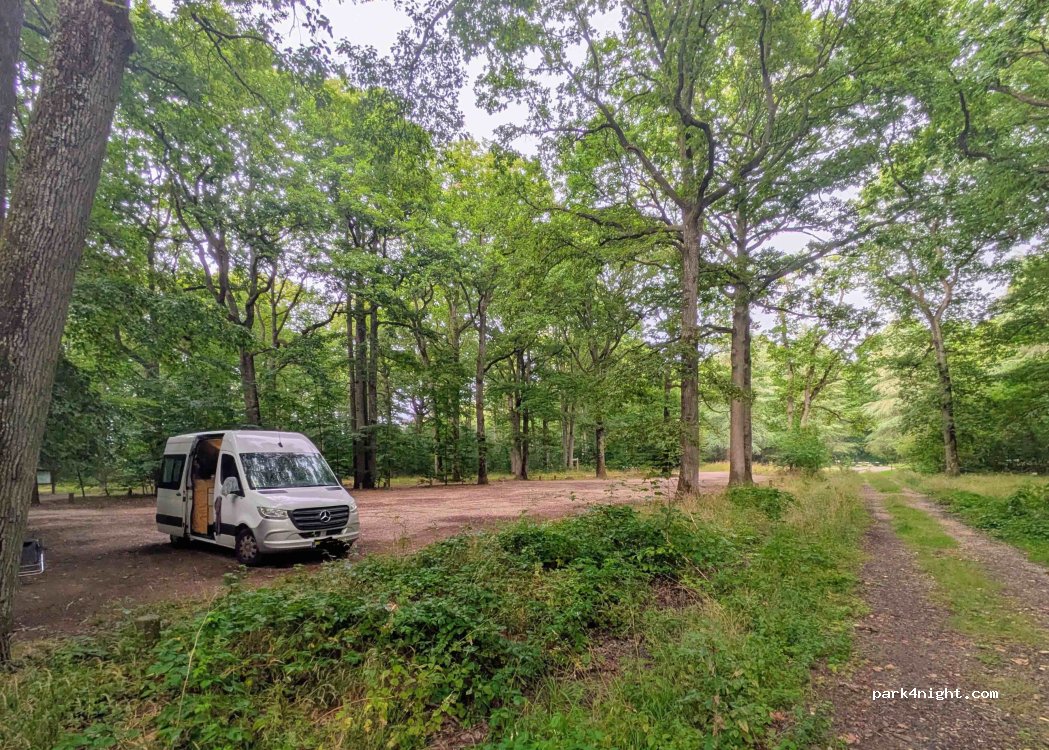 Lovely parking in the woodland. No height restrictions. No facilities. When we arrived only one other van but filled up through the night with late arrivals. Generally quiet apart from van movements.
