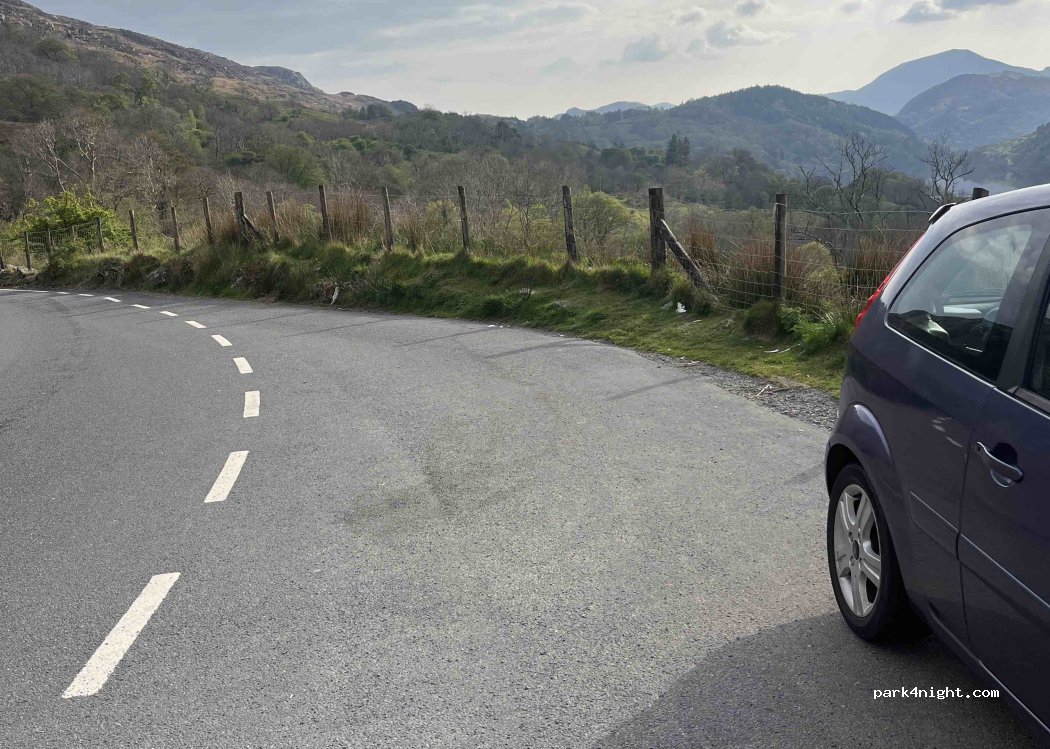 Lovely lay by at the side of the road, which over looks Llyn Gwynant. One of the most beautiful views in the UK! Only down side is the road is on a slight bend on a semi mountain pass, and cars come around the corner at some crazy speeds, so if you do stay, try and tuck yourself right over.