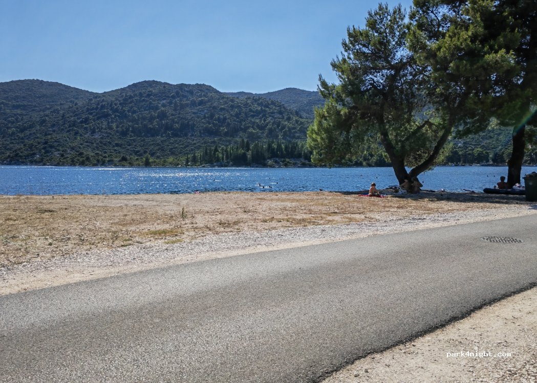 No recomendable.Estuvimos una noche y aparentemente tranquilo, pero desde muy temprano había mucho ruido. Aquí se marcaba como lugar apto para acampar pero no ha sido así porque vino la policía y nos multó con 500kn. Nos dijeron que solo podríamos aparcar en uno de los lados pero en ningún caso acampar y en ninguna parte de la zona. De habernos visto con sillas fuera la multa habrían sido 1000€