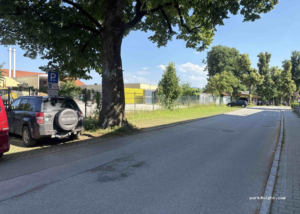 Für eine Nacht ok, aber bestimmt nicht für Übernachtung im Wohnmobil gedacht. Einfache Parkbuchten am Rande der Straße, zwischen Schule, Wohnhäusern und Fabrik.