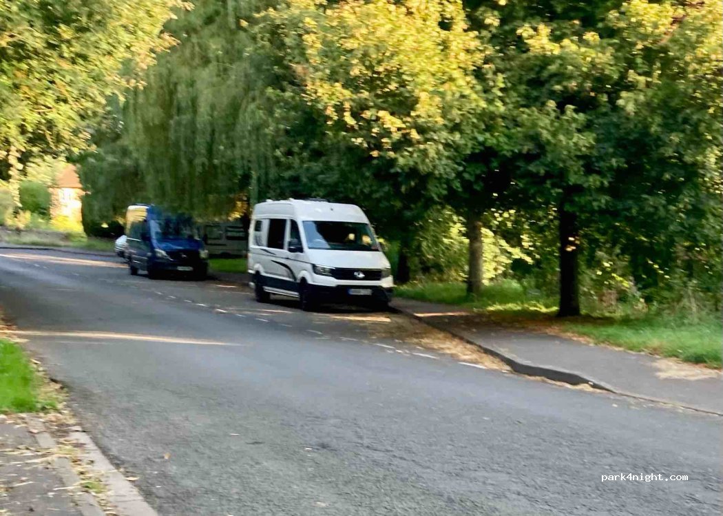 Good spot. Parallel parking along the road next to green or we found this parking bay furthe up the road before start of one way system. Traffic noise but great place to spend evening and night. Nice walks to relax before sleeping.