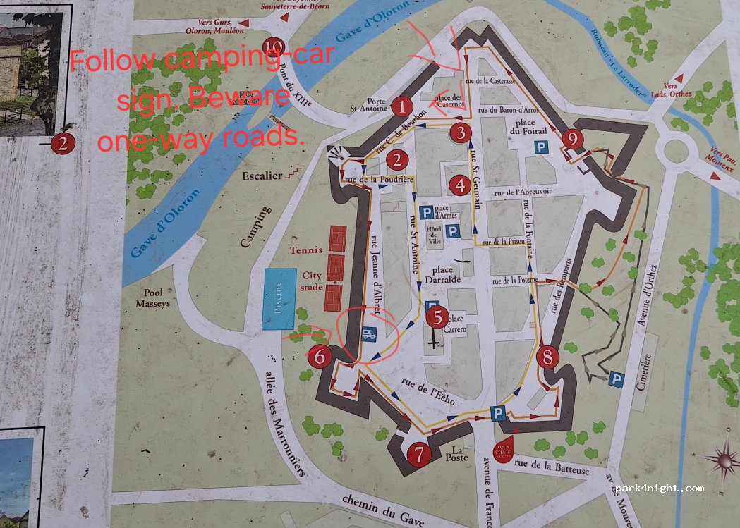 Accès par rue étroite au parking sur les remparts de là rue J. d'Albret. Des emplacements longs et sous les arbres, à côté de l'église, du centre du village, des commerces. Aire de jeux. Toilettes à la mairie à 200 mètres. Pour les services aller sur l'aire de services près du supermarché Carrefour. Nuit calme. 3 parcours de découverte dont celui du fil de l'eau pour voir remparts et rivière.