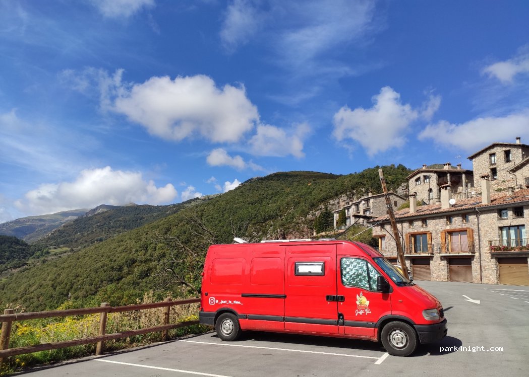 El sitio tiene unas vistas espectaculares del pueblo y las montañas y es supertranquilo para dormir. Nosotros aparcamos en la parte baja junto a la entrada a la ruta de las fuentes del Llobregat, ahí es bastante plano. Estuvimos solos la noche del miércoles.