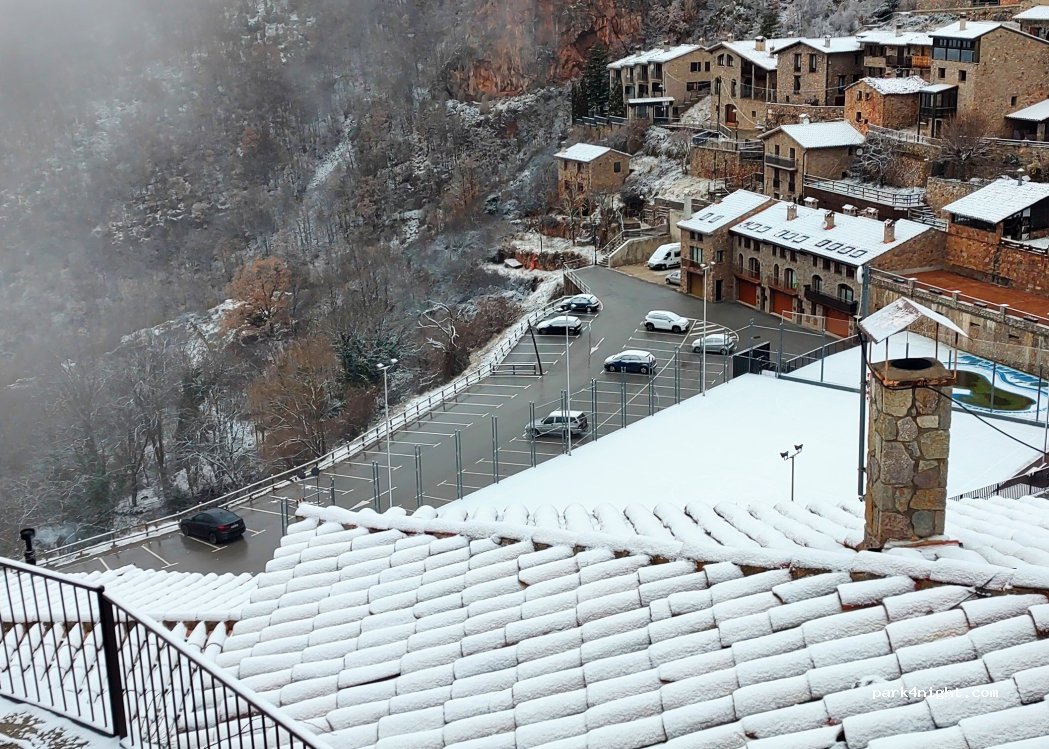 Aparcamiento muy tranquilo con vistas espectaculares y el precioso pueblo de casitas de piedra muy cerca y las tiendas y bares también. Muy cerca de las fuentes del Llobregat, nos ha gustado mucho.