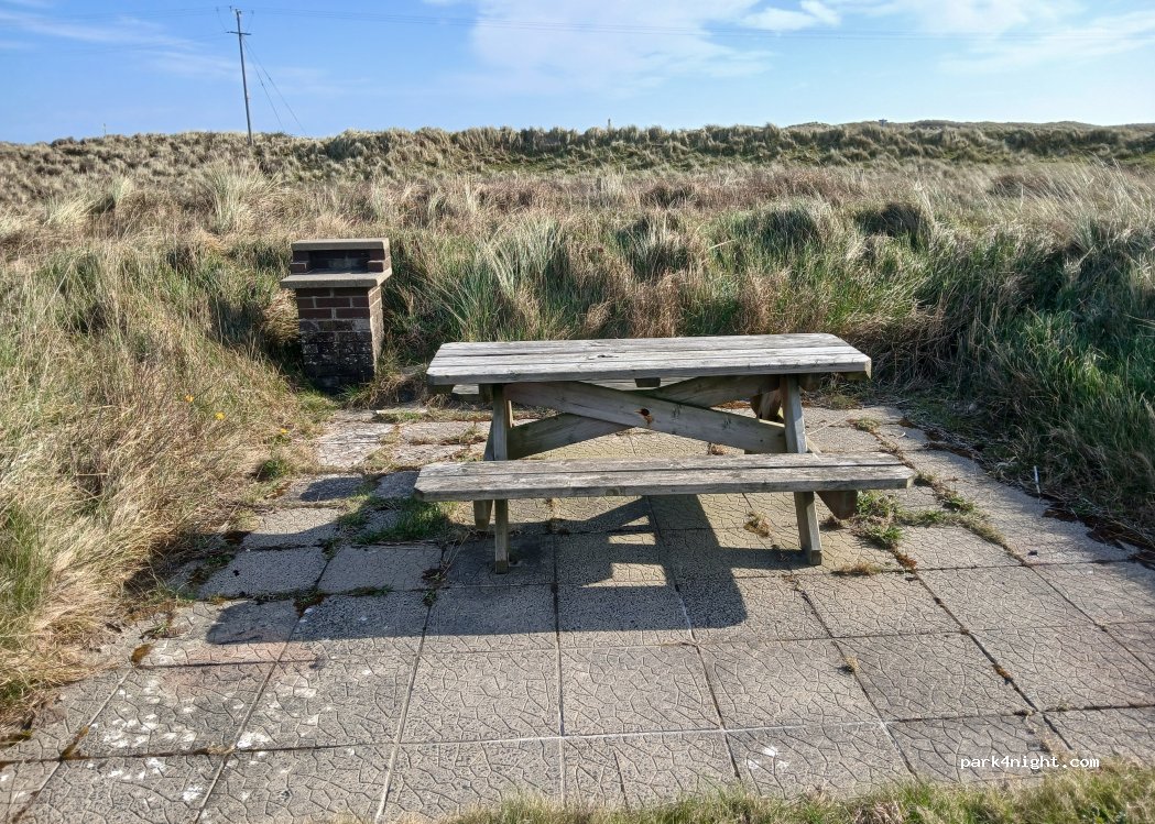 Beautiful quiet spot, arrived in time for the beautiful sunset. Set back from the road in between the dunes. A few other motorhomes dotted along the way, but barely any traffic passing. Perfect spot, would definitely return. Each spot seemed to have a picnic bench, bin, and brick built bbq