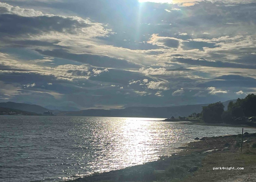 Sehr schöner Stellplatz. Direkt am Fjord. Die E6 verläuft etwas oberhalb, wodurch man bis 23:00 einiges an Verkehr hört. Danach fährt nur noch selten ein Fahrzeug.