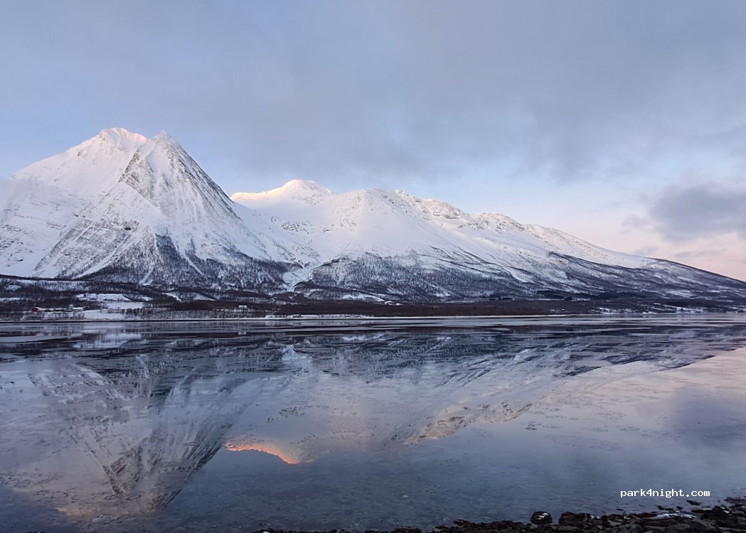 Parcheggio sull’erba a bordo fiordo adiacente i casotti dei pescatori. Nonostante dia praticamente sotto la E6 notte ottima, silenziosa e con panorama stupendo