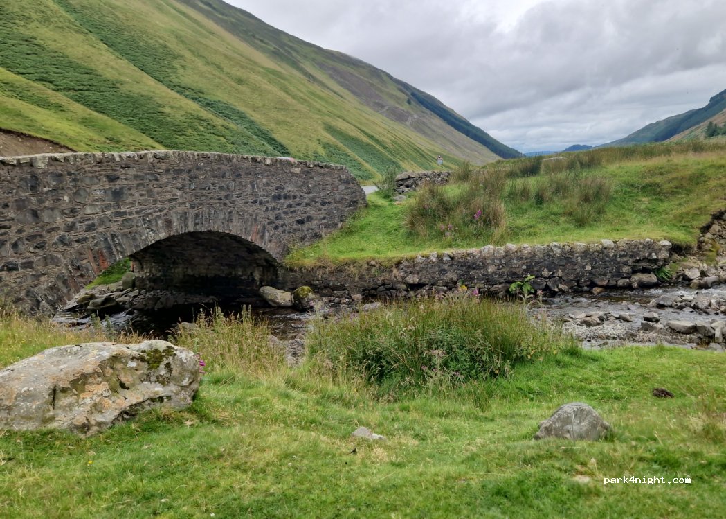 Lovely spot off the road with plenty of space. Arrived in the dark but woke up to lovely views of the stream and mountains. £3 parking via machine. Quiet road until around 7am. No light pollution either.