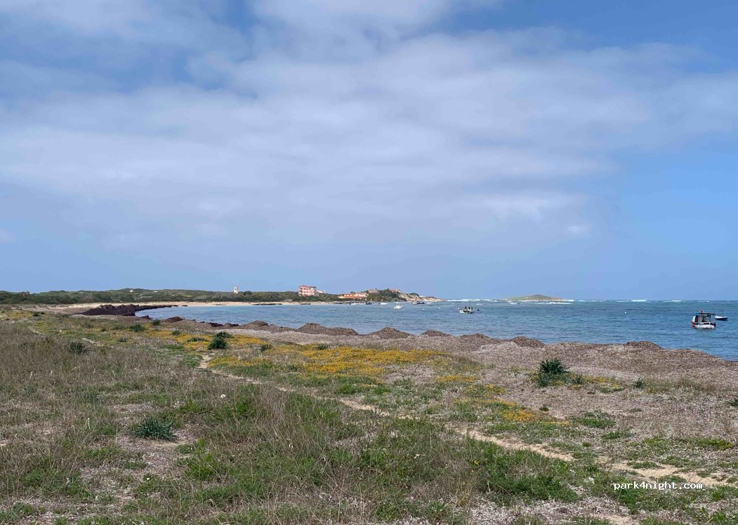 Parcheggio per camper di fronte a una laguna, dietro la quale il mare è separato solo da una spiaggia. Alcuni posti con vista mare. In alta stagione sono disponibili servizi igienici e docce. Vietato l'ingresso ai cani.