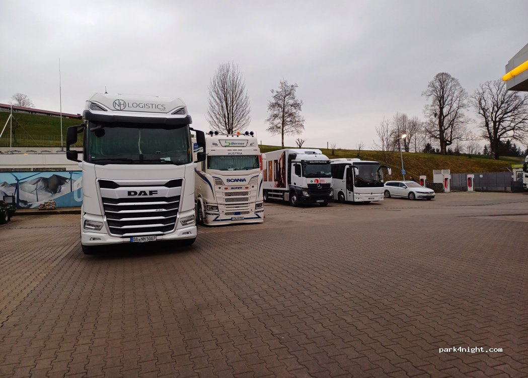 Gebührenpflichtiger Parkplatz direkt an der Tankstelle. 15 € pro Nacht, dafür inklusive Verzehrgutschein von 4 Euro. Frühstück in der Tankstelle empfehlenswert - Preisleistung top.