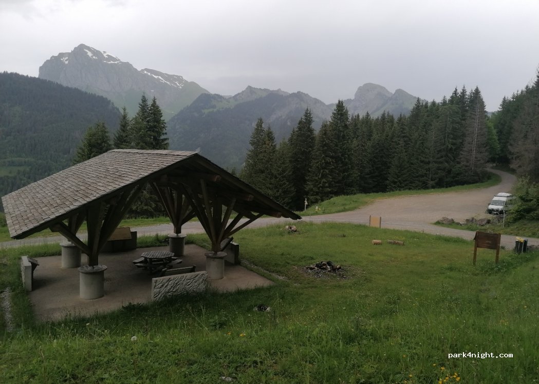 Nous avons aussi opté pour le parking bien dégagé avec vue sur les montagnes. Un grand abri avec tables à disposition. Départ de randonnée et parcours VTT. Le bruit des vaches et des oiseaux !