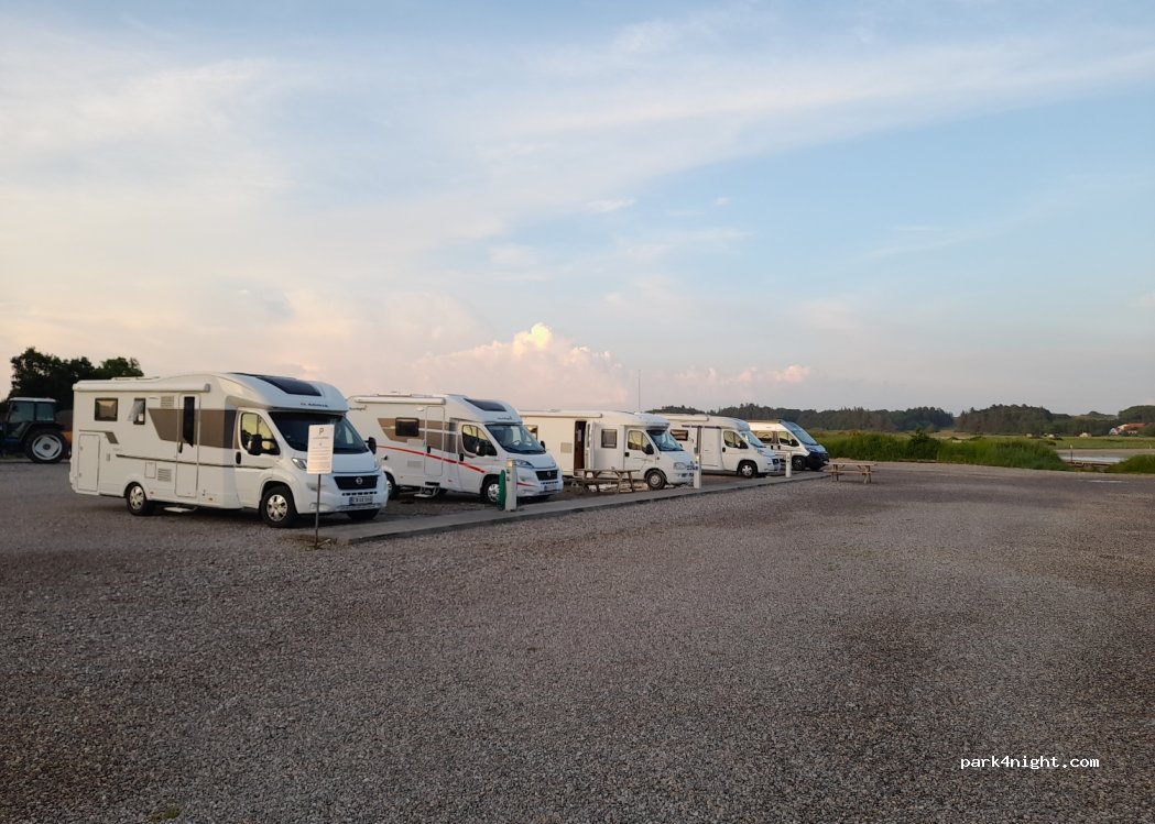 Petite aire agréable et très calme face au petit port de plaisance. Eau et électricité compris. Coût de 140 DKK pour la nuit. Paiement en caisse automatique. Lors de votre paiement, un code d'accès est donné pour utiliser les toilettes et les douches. Pas de vidange des eaux grises et des eaux noires. Je recommande cette étape.
