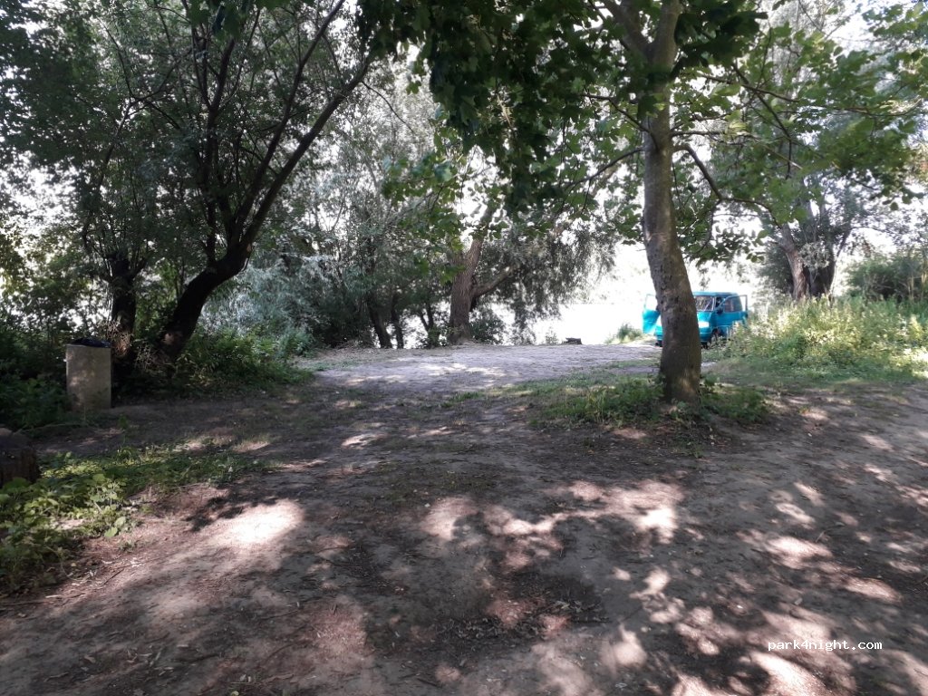 At the edge of the water with the swans. Accessible in van but not wider because narrow and wooded path. 2 possible accesses. Shady and quiet except for the noise of the train and some distant barking. Trash and a bench.