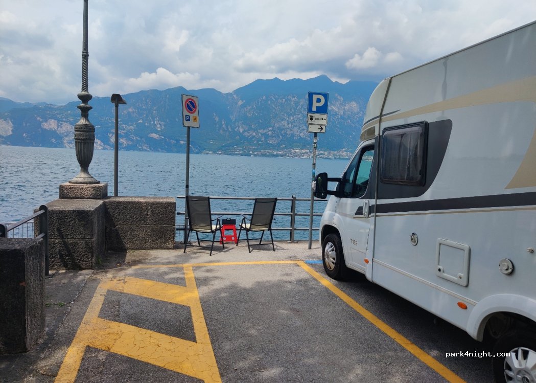 Parking z pięknym widokiem na Gardę. Poza sezonem bezpłatny, niedużo miejsc, przy drodze. Dość równy teren.