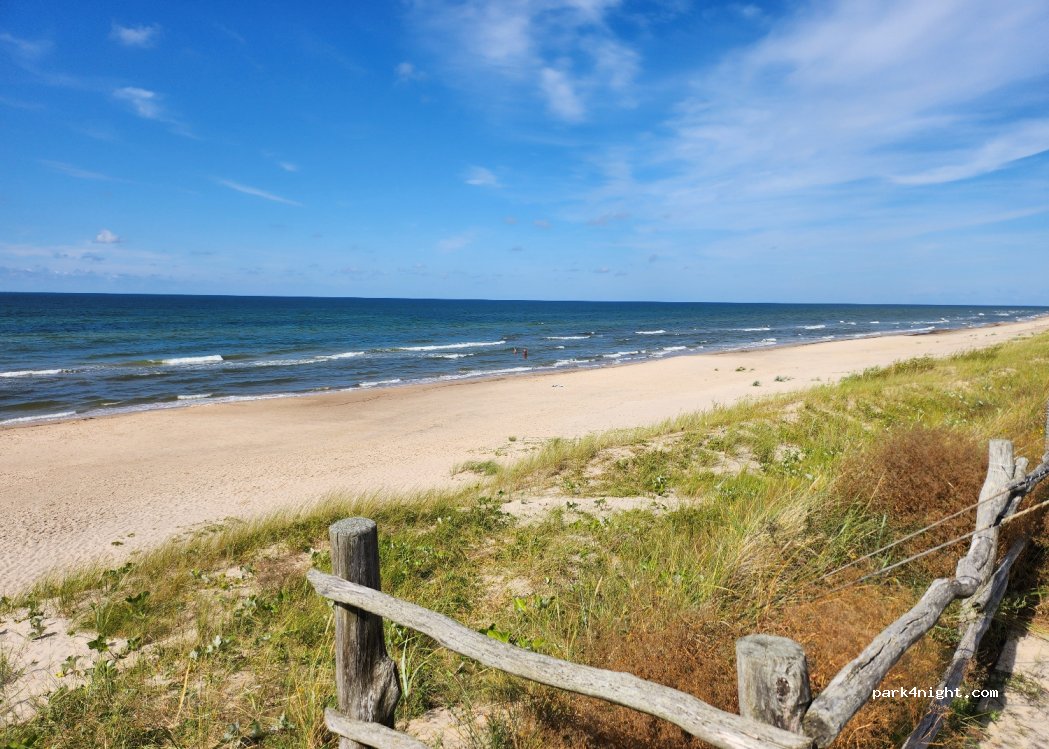 Natur Camping mitten im Kiefernwald, hinter der Düne. Strand sehr schön und menschenleer. Es gibt ein paar Tische und Bänke am "Zentralplatz", teilweise überdacht. Solar Dusche und Ökotoiletten, aber die sind in gutem Zustand, werden regelmäßig gereinigt. Kein Strom, keine VE, dafür totale Ruhe. Wir haben 15 Euro gezahlt, wahrscheinlich zu viel, aber egal.