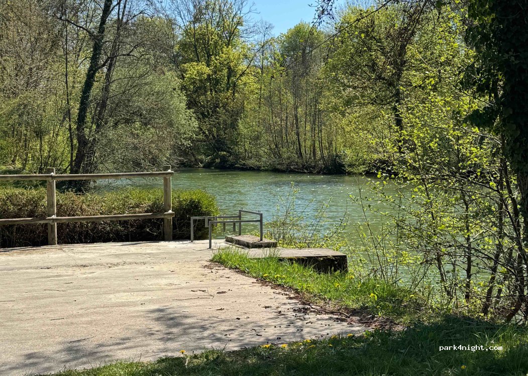 Parking au bord de l'eau et des bois, relativement calme et plat. A noter, la présence d’une caméra de surveillance. On entend les trains passer juste à côté, mais ça va. PS : il y a de nombreuses ornières pour y accéder ;) Et un tunnel limité à 3m.
