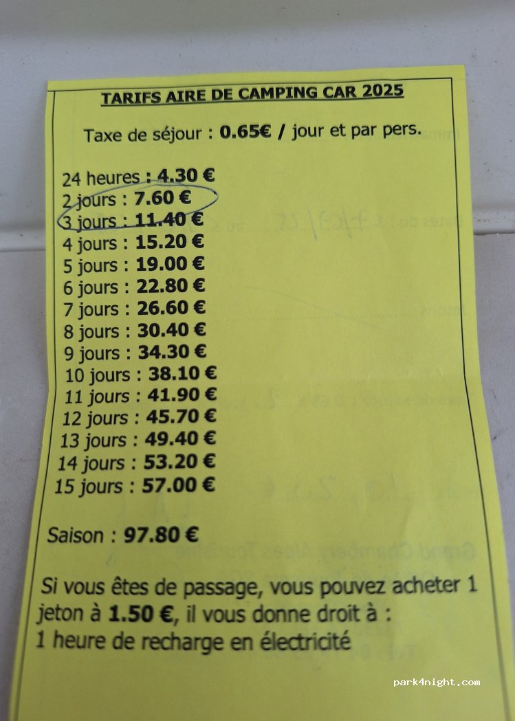 Parfait eau vidange électricité fonctionnent jeton disponible 1.50€ à l'office du tourisme. Différents commerces à proximité. Parking caravaneige prendre le ticket à l'office du tourisme.
