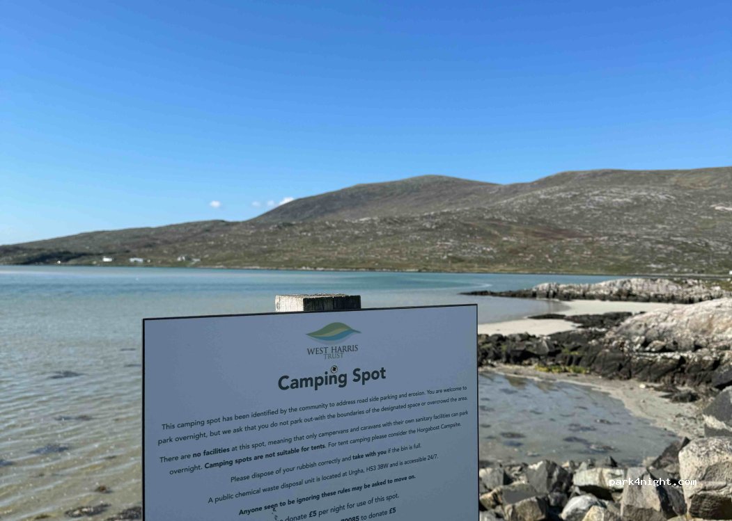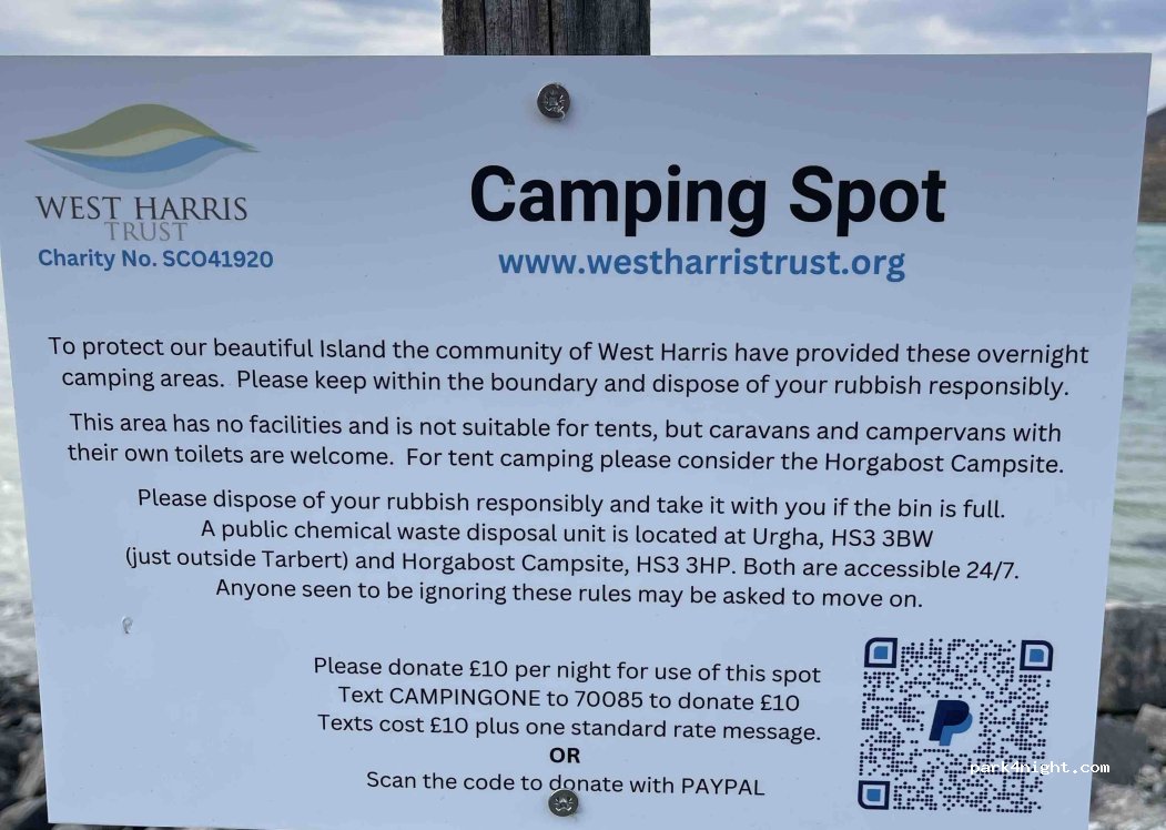 Great location,stayed on two different nights, paid the £5/night easily on west harris trust website,sign with instructions how to pay by mobile text as well, nice rocky cove there gives shelter from wind, fantastic sunsets, sign also gives info to CDP water.grey water facility at the waste/recycling centre 15 mins drive away, beautiful spot, very happy to pay just £5 for this approved spot