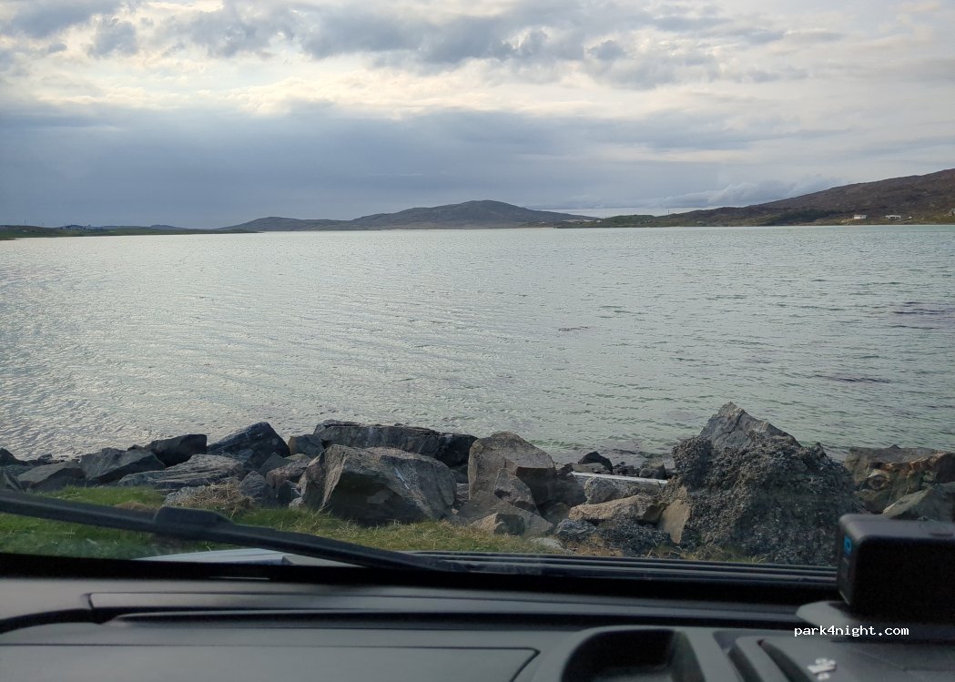 Really nice spot looking straight out onto the bay. It's a little parking space big enough for 3 or 4 campers facing forward. it's a "West Harris trust camping spot" so it's fine to stay the night here - they ask for a £5 donation and they provide a bin. The road is pretty quiet, not many cars by night.