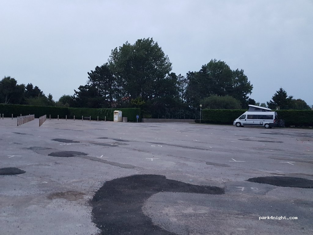 A very large, flat parking area, empty when we arrived at 1800 on a Saturday night, though a campervan arrived later. Very quiet and though no services, recycling and refuse disposal are available. A thank you to the local people for letting us use this facility ahead of our leaving for a 30 minute drive to the ferry tomorrow morning.