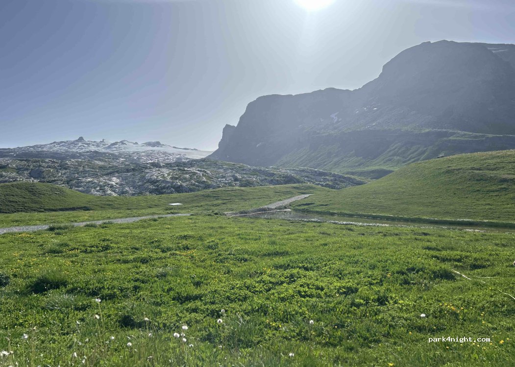 At the Sanetsch pass, almost flat dirt parking in some places. No service. Access height limited to 3.30 in tunnels to climb. Great motorhome refrain! Magnificent view of the Diablerets and the 4000 valaisans.