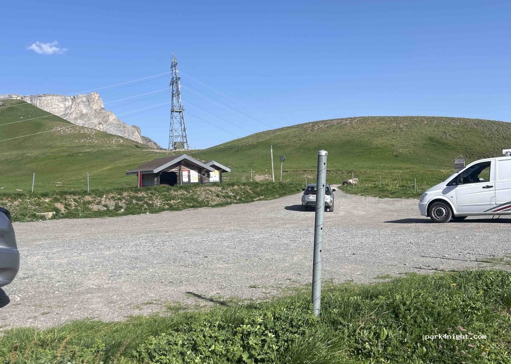 Al passo del Sanetsch, parcheggio in argilla, quasi piatto in alcuni punti. Nessun servizio. Altezza di accesso limitata alle 3.30 nelle gallerie da salire. I grandi camper si astengono! Magnifica vista sui Diablerets e sui 4000 vallesani.