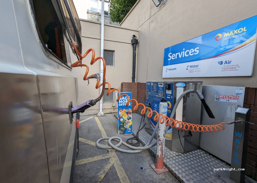 Wasserhahn, geringer Wasserdruck, kostenlos, Selbstbedienung, im Servicebereich, an der Tankstelle Maxol. 20 Minuten, um 100l zu füllen.