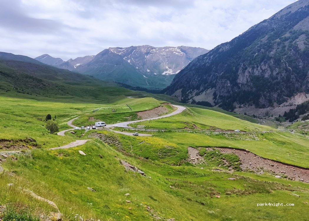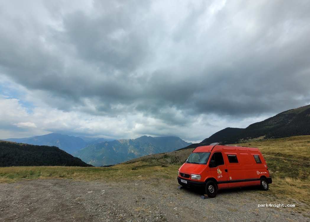 En teoría no se puede pernoctar. El Ayuntamiento de Benasque ha prohibido hacerlo fuera de los lugares habilitados. Quizás este dentro de los límites del parque natural. Es ideal para hacer rutas. Está junto a una curva de la carretera de Cerler 1.500 a Cerler Ampriu 1.900.