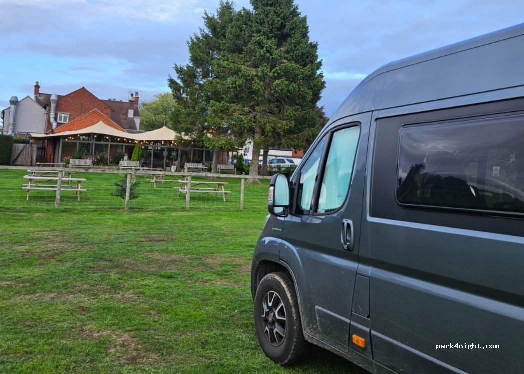 Great pub stop-over. Lovely food friendly staff. Bonus, wake up with Llamas as neighbours. Open field at the rear of the pub. Plenty of room for few vans. Fairly level ground. No problems. Really enjoyed a nice quiet night sleep.