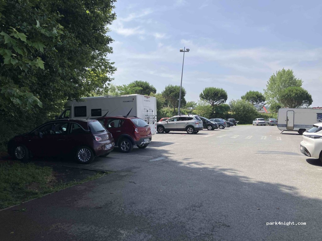 25/8/19. Un parking de zona comercial. Con gasolinera al lado. Por lo menos 40 minutos de paseo hasta el centro de Bayona.
