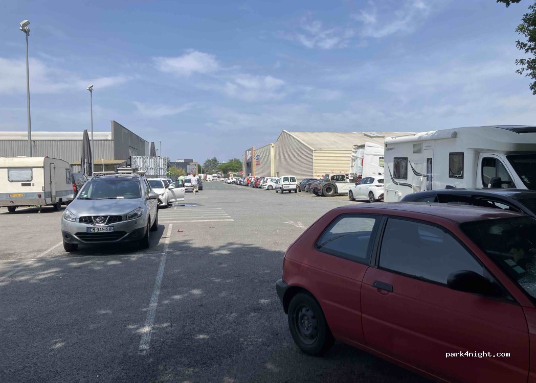 Pour rentrer avec le camping car sur le parking Intermarché, c’est quasi impossible. Ce parking est une option. Au fond, à midi, des arbres protègent du soleil et Medor peut faire son pipi. Photo jointe.