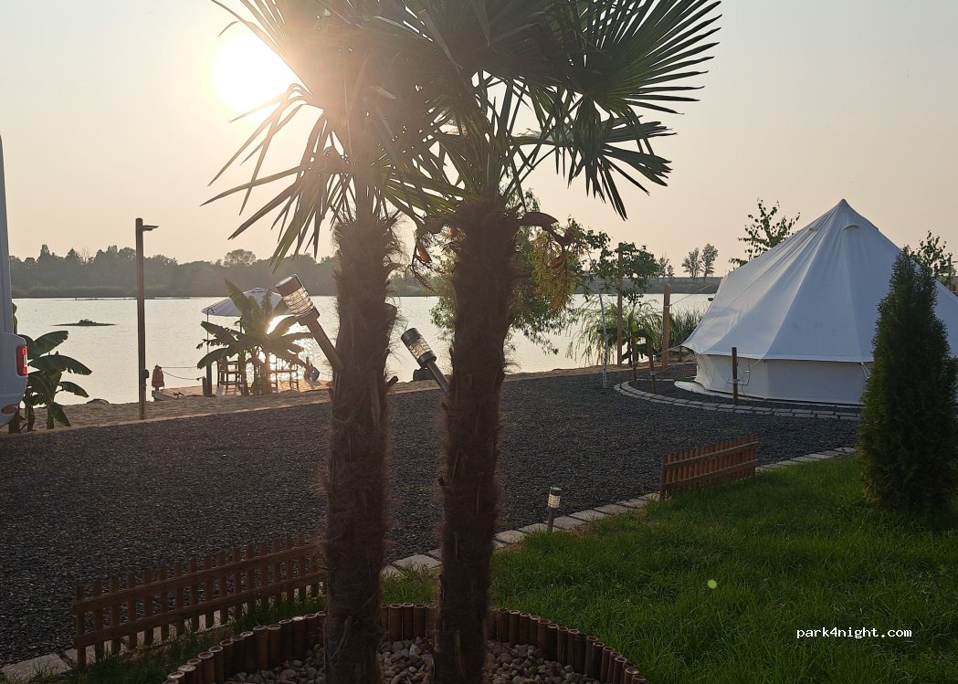 Beautiful site right by the river, a wild camp with two restaurants and a hamburger stand, good beer (also on tap), excellent food, and a beautiful view.