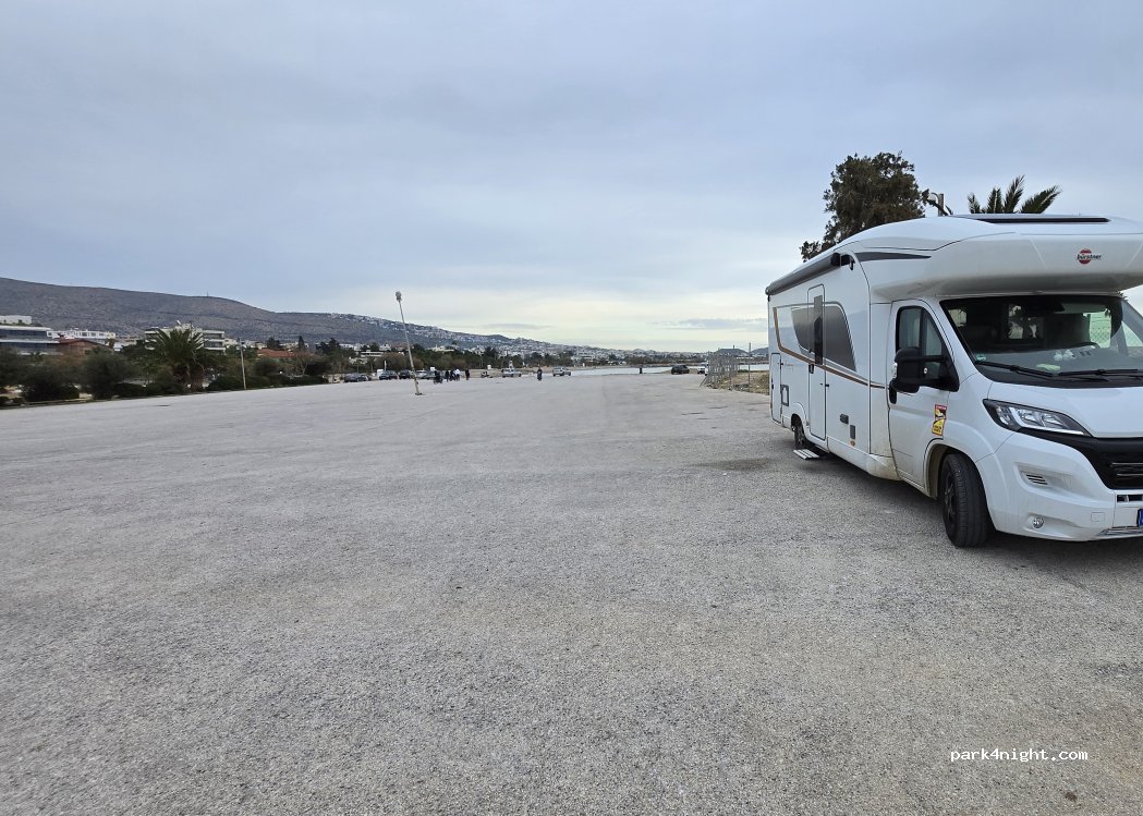 Parking at the beach glyfada In the background there is an abandoned bar and fifteen cats that people come to feed. The place is quiet at night. We stayed here for one night. It helps out well because the spots near Athens quite fresh are rare. In the morning the retreats come to bathe and chatter in the water. The people are nice. The beach and the water are dirty instead of transition. Wc (chemical block)