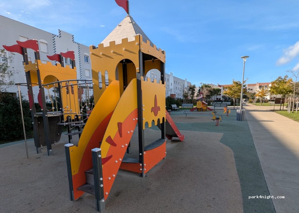 Era tarde de noche, buscábamos un sitio tranquilo y seguro para passar la noche. Buen sitio, en zona residencial y areas verdes, junto a parque infantil. Sin nada, y pero perfecto para dormir.